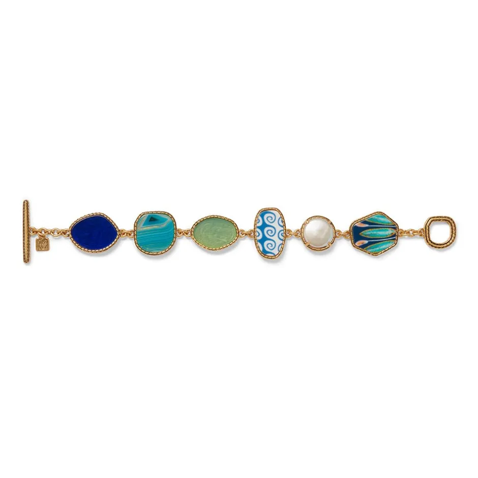 This eye-catching bracelet pays tribute to three striking glass pieces in The Met collection: a stripy blue inlay dated to Early Imperial Rome (1st half of 1st century A.D.) and two Egyptian inlay fragments—one bearing a floral design (100 B.C.–A.D. 100), the other a spiral pattern (200 B.C.–A.D. 100)—crafted by way of a mosaic glass technique, which allowed the artisan to create a repeatable image.