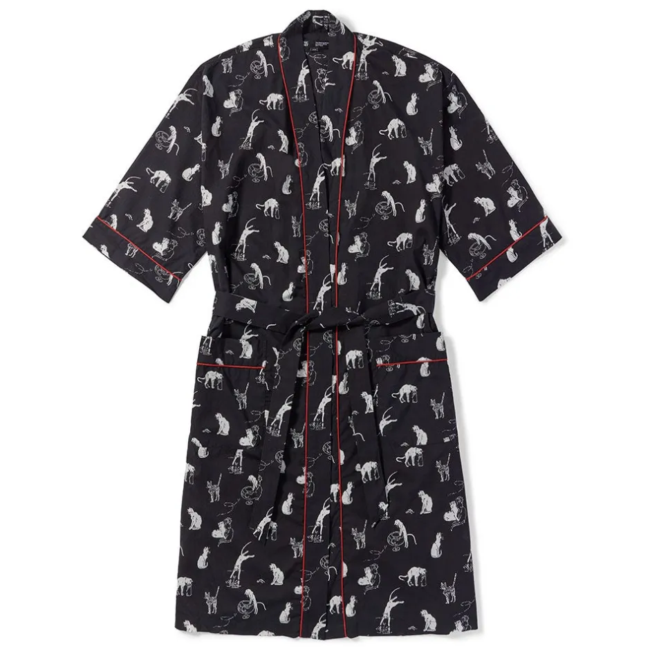 This cotton robe celebrates the graphic artist Théophile-Alexandre Steinlen’s (French, b. Switzerland, 1859–1923) fondness for felines. He drew cats throughout his long career with unvarying grace and skill—his models were the habitués of Parisian rooftops, streets, cemeteries, and garbage bins around the Montmartre neighborhood where he resided. Their antics are illustrated in the artist’s famous book Cats: Pictures without Words (1898), a copy of which is in The Met’s Drawings and Prints collection.