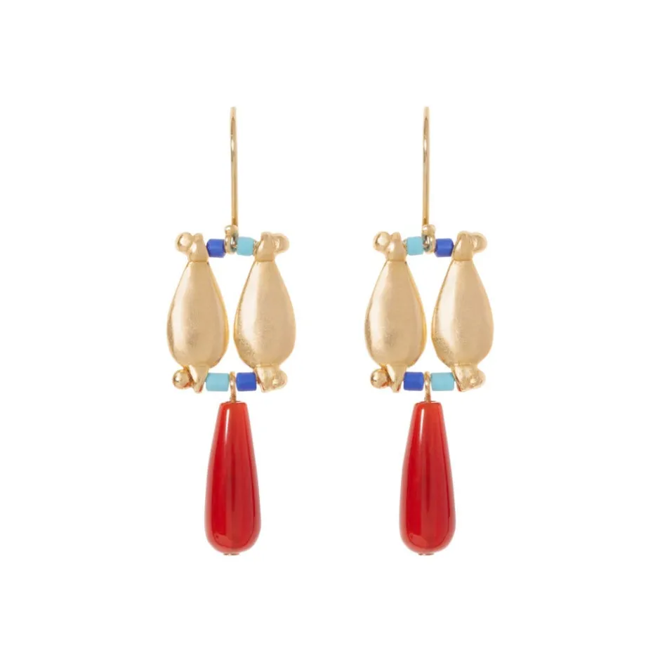 Our tiered drop earrings take their bold design from an ancient Egyptian broad collar in The Met collection. The earrings are crafted in 18K gold plate with carnelian drops and colored glass beads; the ear wires are 18K gold-plated sterling silver.
