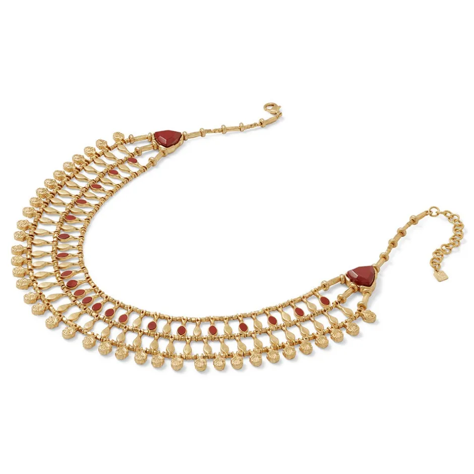 This handcrafted necklace evokes a splendid Egyptian collar (ca. 1504–1450 BCE) of amulets featuring the “nefer” hieroglyph, which signifies a word meaning “good” or “beautiful.” The auspicious symbolism of the Museum’s adornment suggests that it may have been made to bring good fortune to the wearer—in this case, a wife of the pharaoh Thutmose III. Our contemporary visions of this outstanding broad collar are both eye-catching and lightweight for an effortless statement.