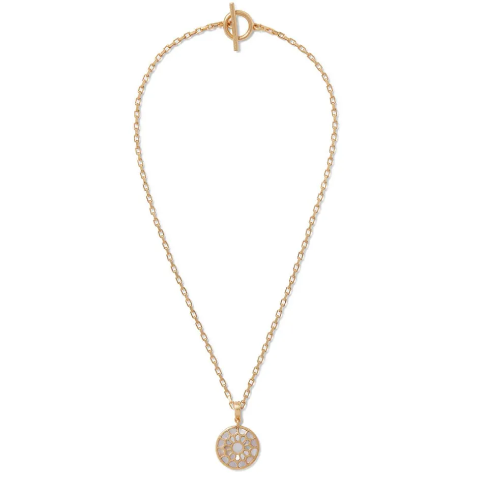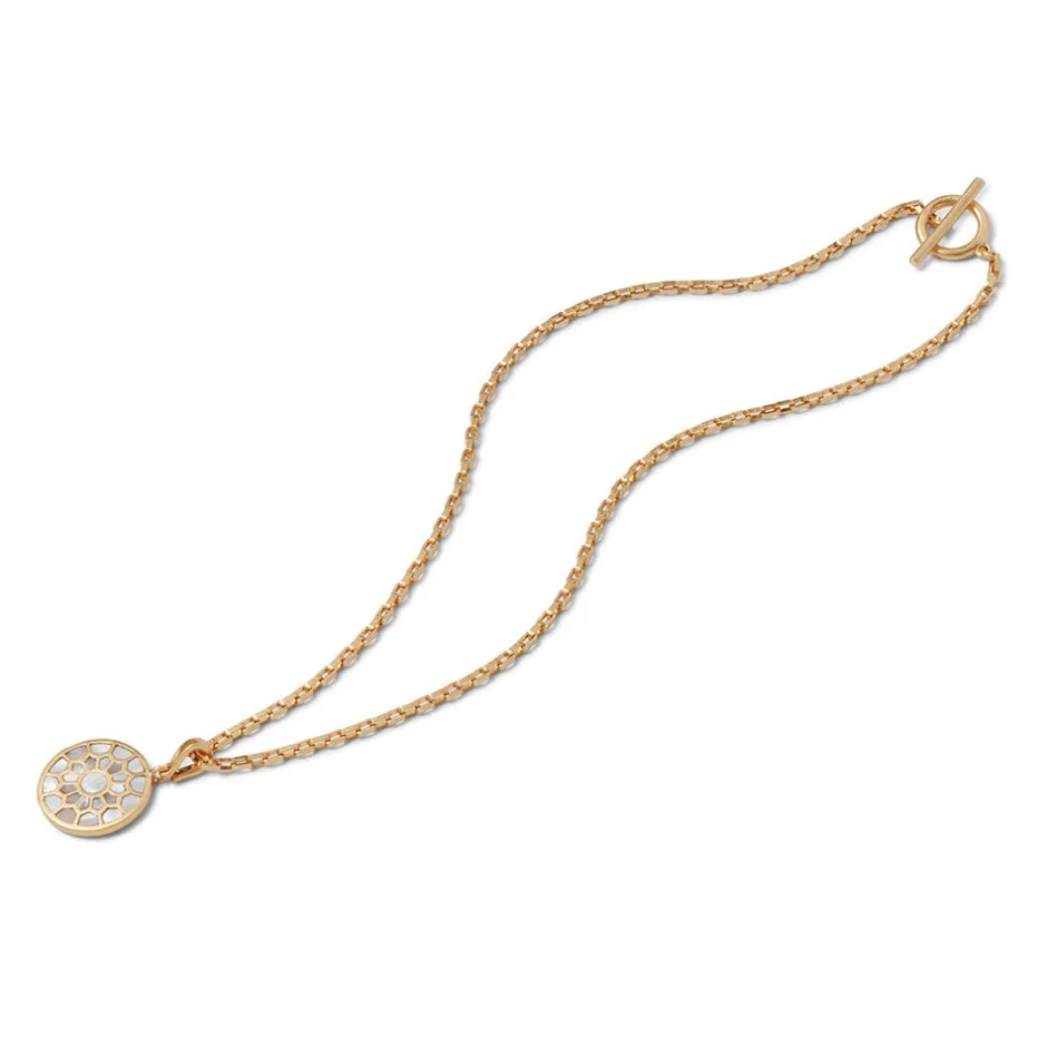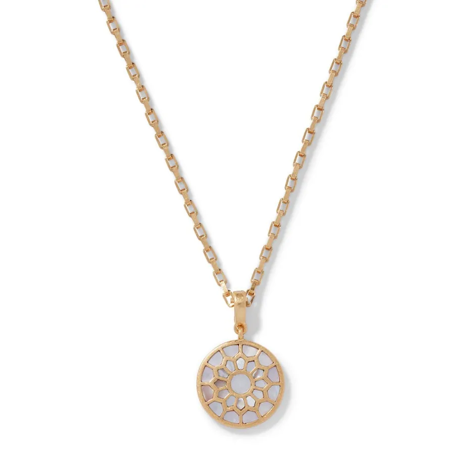 The naturally iridescent mother-of-pearl pendant adorning this necklace reinterprets a lustrous Indian powder flask (18th–19th-century) in The Met collection. Crafted in Gujarat for the export market, this artful vessel of shimmering green turban shell was created to contain gunpowder. The Museum is home to a vast collection of diversely decorated powder flasks from around the world.