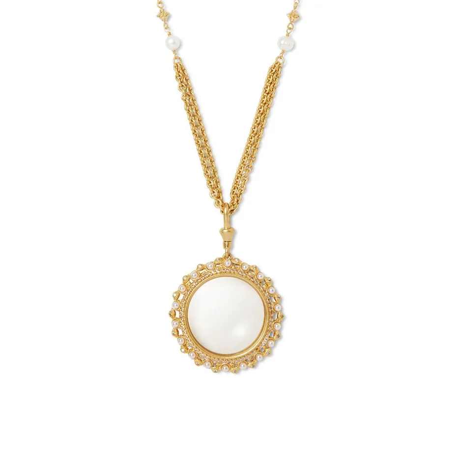 This luminous necklace with a removable magnifier pendant evokes a gold-and-pearl rosary made in the 17th–19th-century Philippines and now in The Met collection. Between the 16th and 19th centuries, Spanish missionaries traveled to the Philippines and brought with them, among many other Western traditions, the Catholic rosary: a string of beads used to count repetitions of prayers. These devotional beads assumed various sizes and forms, and continued to evolve until a basic design and sequence of prayers were standardized in the 15th century. In the Philippines, which notably boasts the second largest gold reserves in the world, many rosaries and tamborins—a type of Philippine necklace that combined the European rosary with pre-Hispanic and Asian visual…See More
