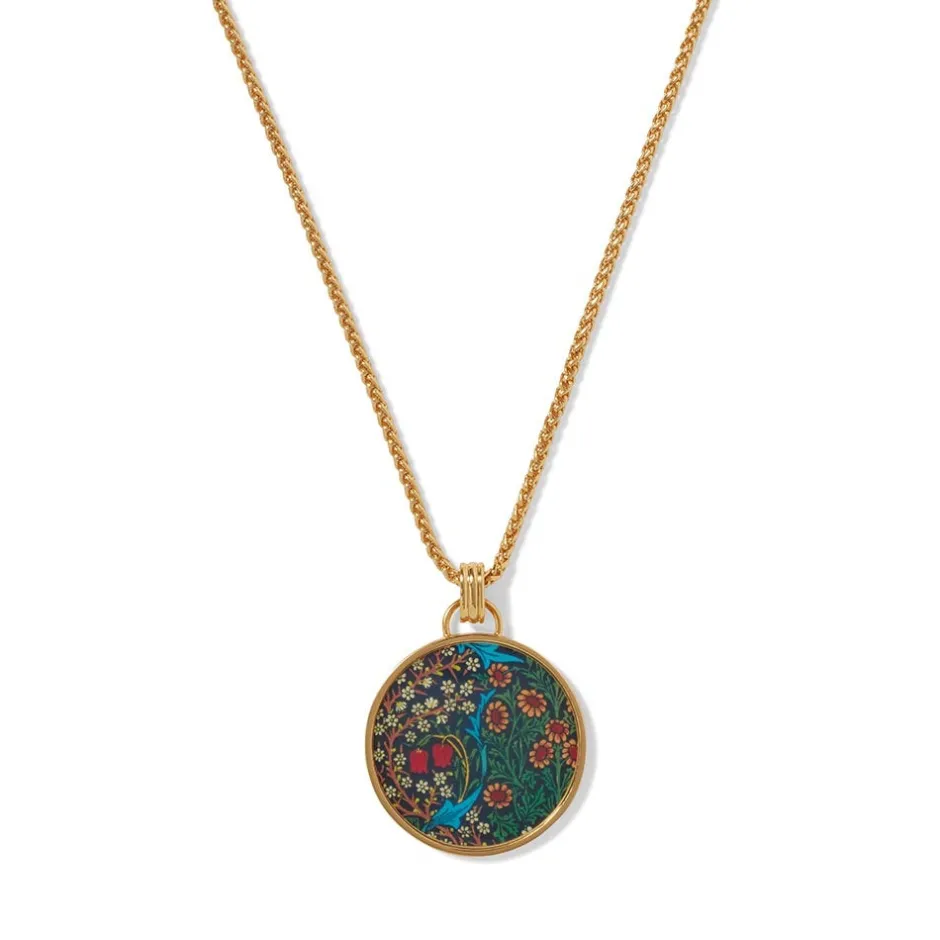 The botanical motif adorning this enamel pendant comes from Blackthorn (1892), a block-printed wallpaper design approved by William Morris (British, 1834–1896) and now in The Met collection. Morris was a prolific designer of elevated fabrics and decorative objects. Profoundly inspired by nature, he created mesmerizing motifs comprising rambling blooms and lush fruits.
