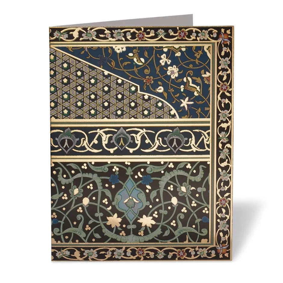In the early 16th century, Iran was united under the great Safavid dynasty (1501–1722). The Safavids actively supported the book arts, and manuscripts from this period are noted for their exquisite calligraphy, illuminations, paintings, and bindings. A splendid manuscript (1524–25) from a Khamsa (quintet) by the Persian poet Nizami (present-day Azerbaijan, 1141–1209), now in the Museum’s Islamic art collection, informs the magnificent details on these striking gold-foil notecards.