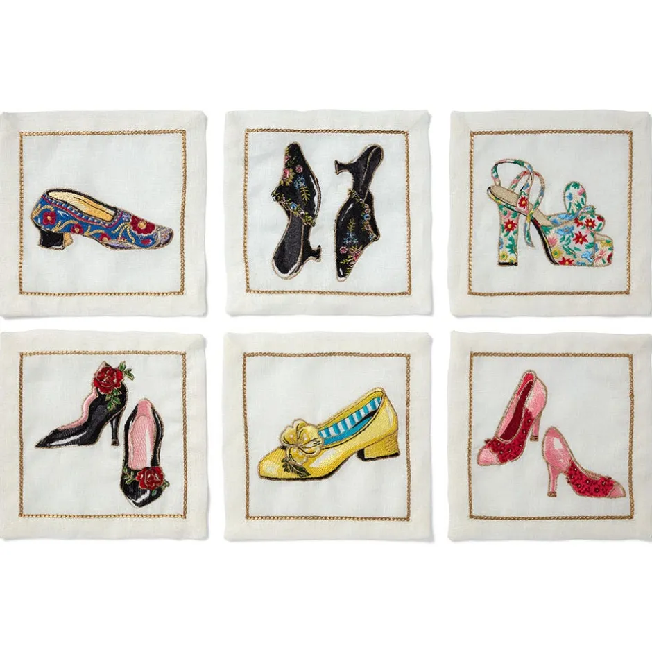 Embellish your tablescape with these elegant cocktail napkins designed by lifestyle and entertaining expert Kim Seybert. Each 100% linen napkin in this set of six is embroidered with the likeness of a stylish shoe from The Costume Institute: a 19th-century British slipper embroidered with stylized flowers; a sleek American or European mule (ca. 1927) elevated by a floral motif on the toe; an Italian platform sandal (1971) with a colorful floral pattern; a classic pump (1958) by Mr. David Evins (American, b. England, 1909–1992), adorned with a striking red bloom on the heel; a sunny yellow shoe made by Pique (ca. 1966) with a flower on the toe; and an Italian pump (ca. 1955) decorated with little blue petals.