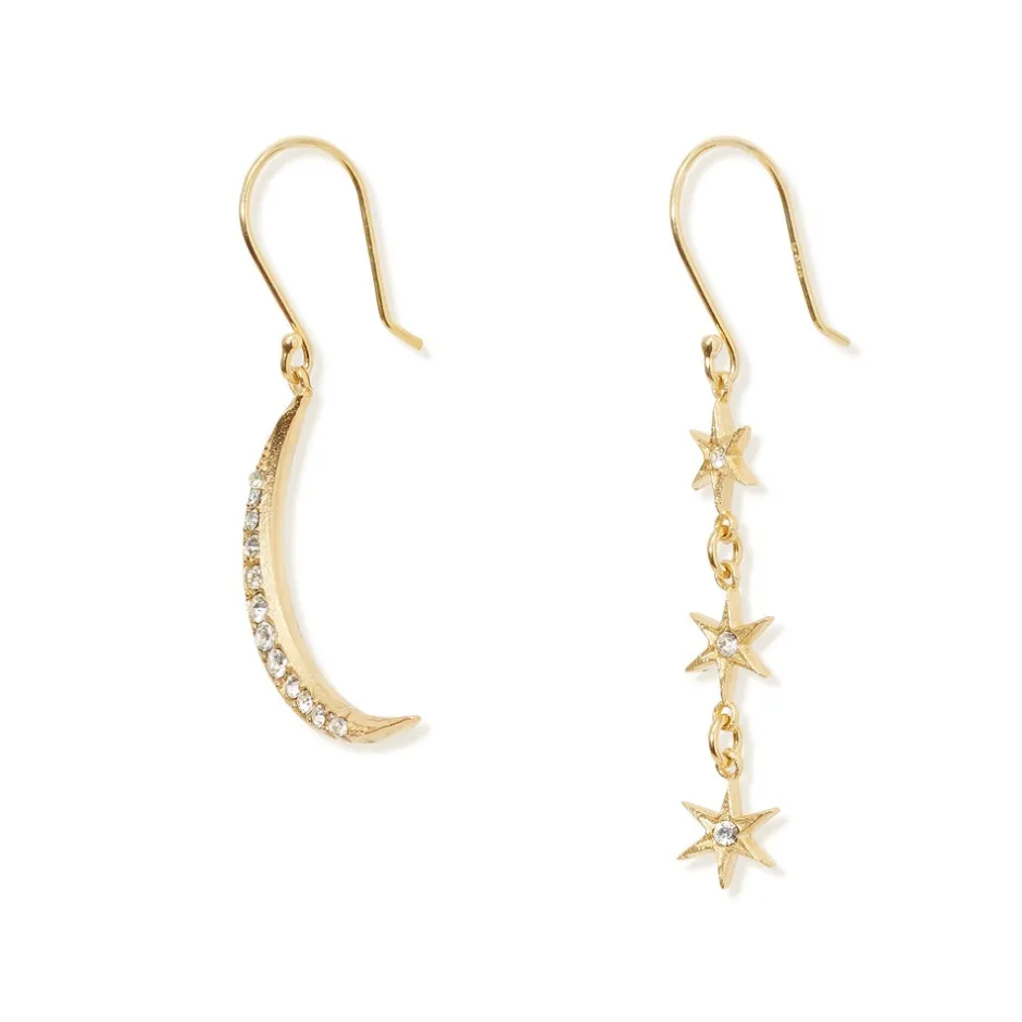 Whether you’re an early riser or a night owl, you will love to wear these twinkling drop earrings in 18K gold plate with sparking Swarovski® crystals. The mismatched pair with a moon and three dangling stars is sure to attract attention—all day and night.