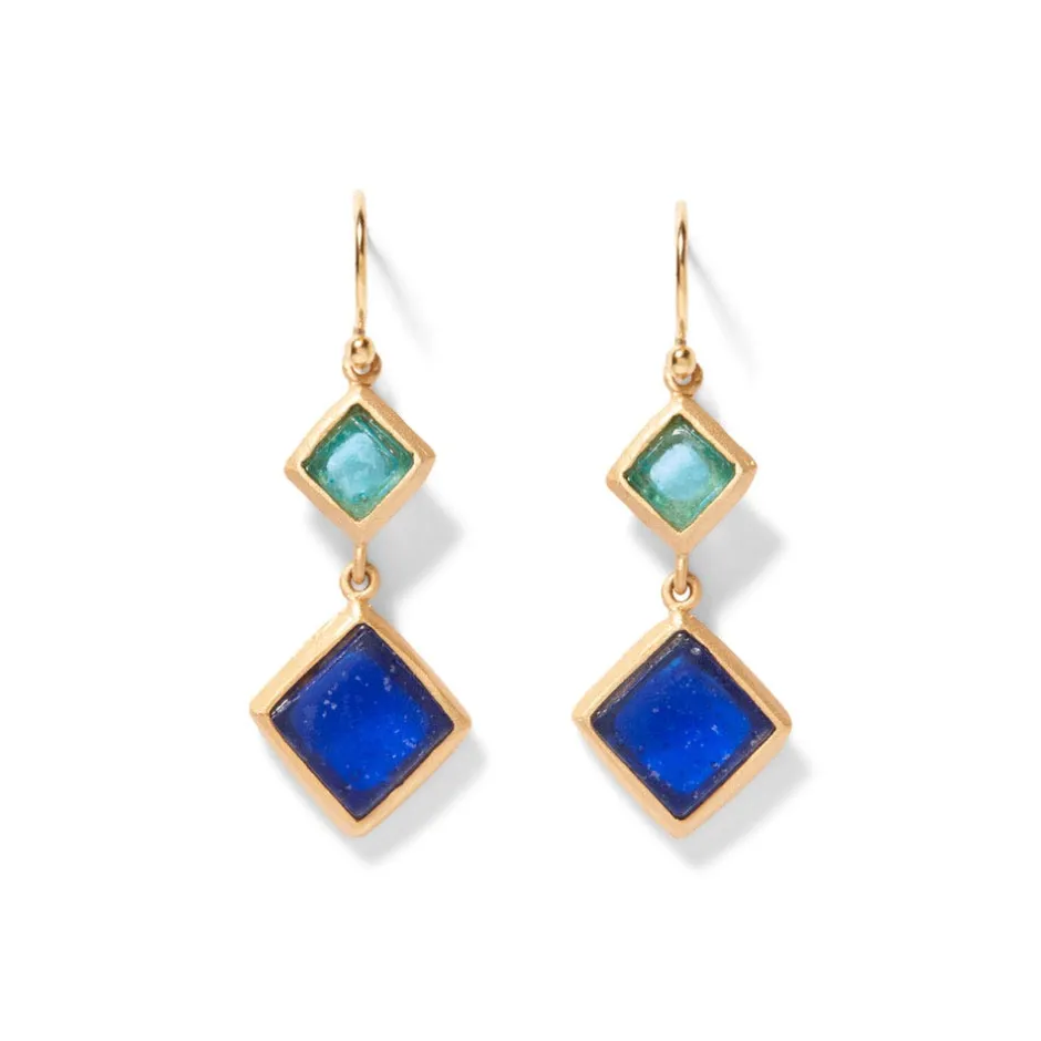 With geometric drops in radiant blue, our stylish earrings recall a beautiful mosaic column in The Met collection by Louis Comfort Tiffany. The earrings feature 18K gold plate and recycled glass stones for modern appeal. Inspired by Byzantine mosaics, the shimmering column, now in the American Wing at The Met, displays L. C. Tiffany’s great artistry and expertise in the medium of glass.
