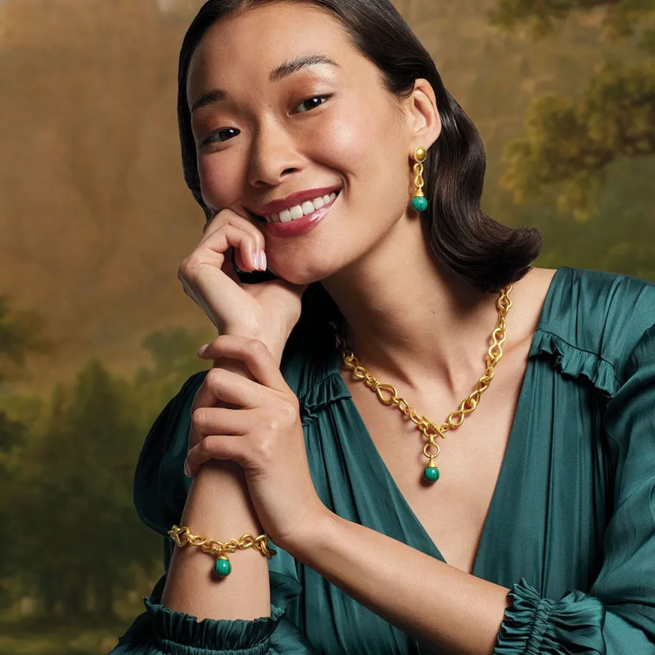 Embellished with green malachite accents, these striking earrings adapt the unique chain link on a gold necklace made in Rome during the 1st century A.D. The Museum’s collection of Greek and Roman art is a proverbial gold mine for resplendent jewelry. It traverses cultures and spans millennia, from the Neolithic period (ca. 4500 B.C.) to the 3rd century A.D. Due to the natural elements in this jewelry, the color of the stones may vary.