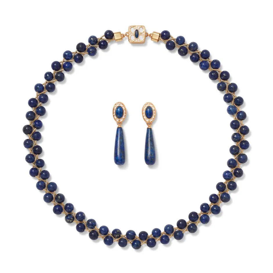 This rich blue jewelry is inspired by a spectacular Spanish baldric (first half 17th century), a type of crossbody belt or chain often worn to support a sword. Much of the scholarship around jewelry fashions throughout history is informed by portraits in which the sitters wear a certain style of adornment. An enameled example very much like the one displayed in The Met’s Vélez Blanco Patio, dedicated to the decorative arts of Spain between 1450 and 1700, is worn diagonally across the chest in an early 17th-century portrait of a young man. We’ve honored the blue detailing on the original, featuring champlevé enamel, with semiprecious lapis and enamel elements.