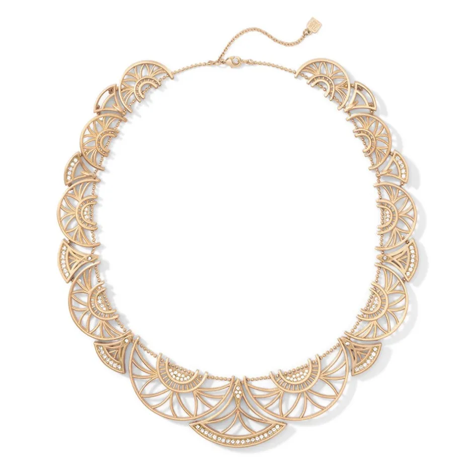 This thoroughly dramatic statement necklace takes its fanciful name from French ballet dancer Zizi Jeanmaire. The openwork fan design is based on the Art Deco work of Romain de Tirtoff (French, born Russia, 1892–1990), better known as Erté. The necklace’s stunning two-tone design showcases satin-finish 18K gold plate and rhodium plate with more than 100 Swarovski® crystals.