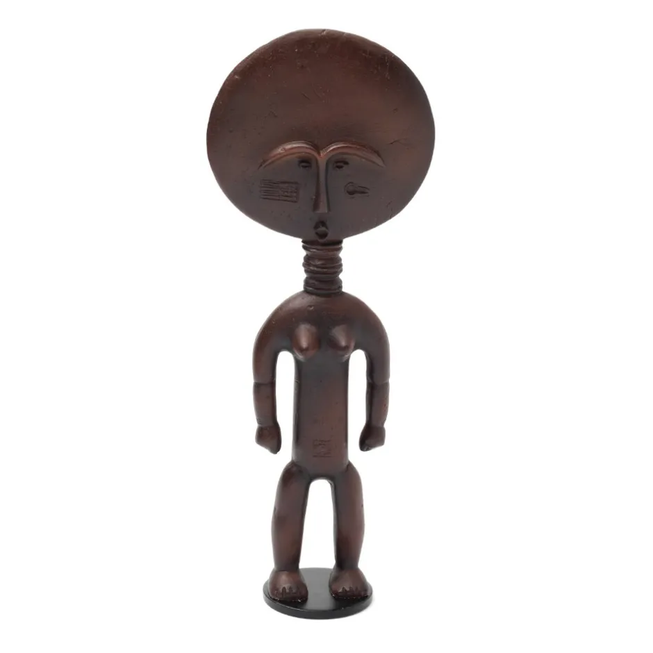 This small resin reproduction depicts an akua ba figure, one of the most recognizable forms in African art. Consecrated by priests, such figures are carried by women who hope to conceive a child. The flat, disk-like head is an exaggerated convention of the Akan ideal of beauty, while the sculpture’s flattened shape allows it to be carried against a woman’s back, wrapped in her skirt. The rings on the figure’s neck signify beauty, health, and prosperity in Akan culture.
